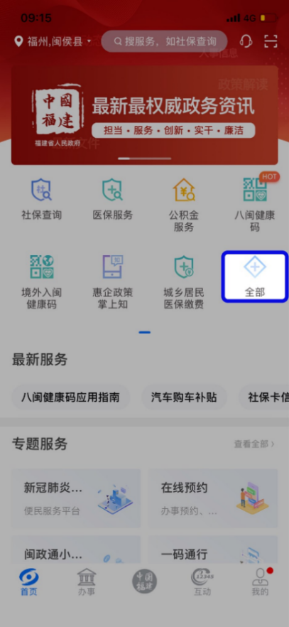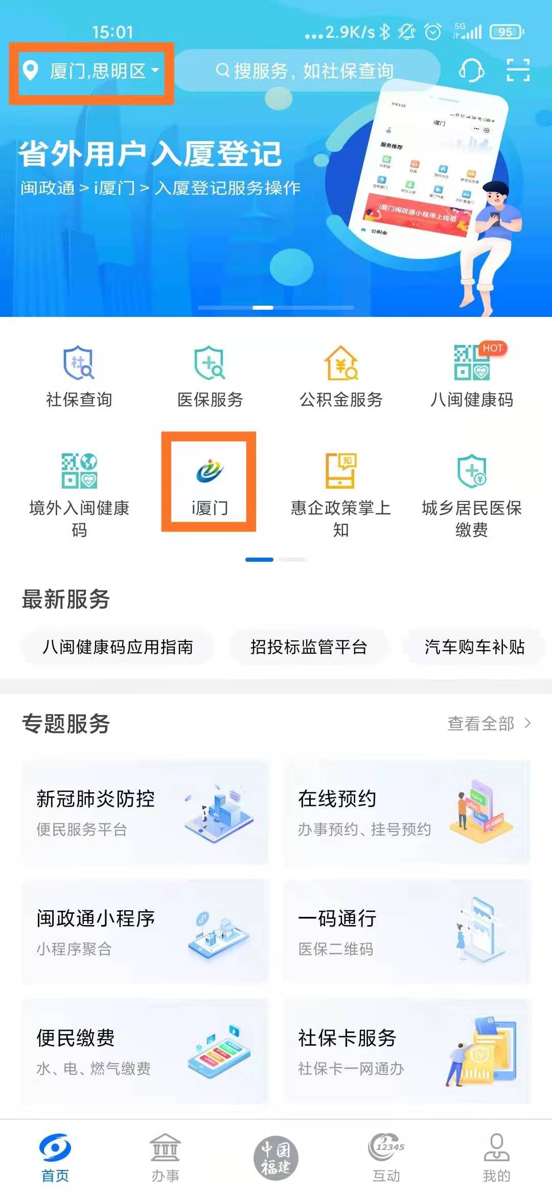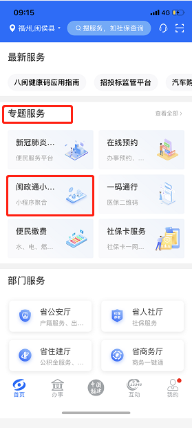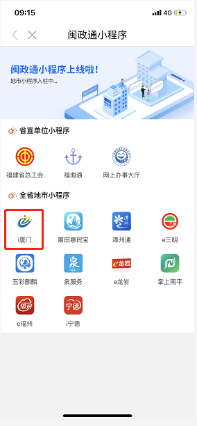 用户实名登录闽政通App,点击首页选择“i厦门”小程序(需定位在厦门或手动切换服务地为厦门可见)或选择“专题服务”模块,进入“闽政通小程序”专题页。