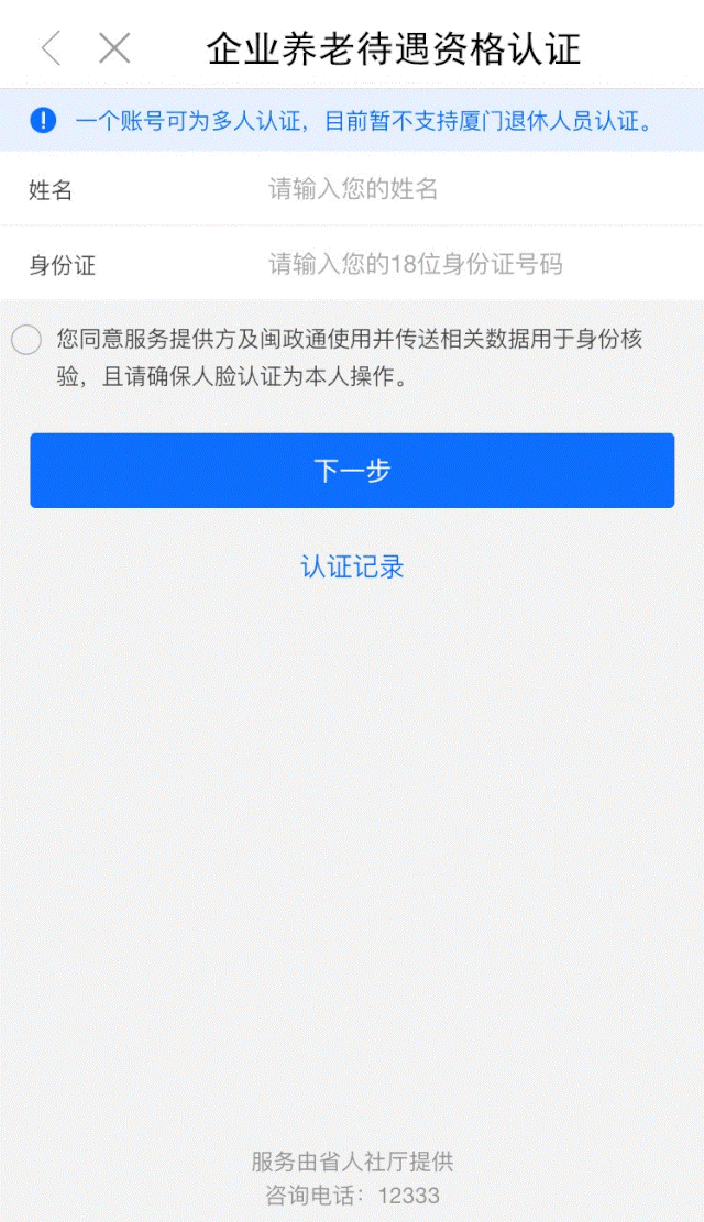(1)一个闽政通账号可为多名退休职工进行认证,且无需退休职工本人注册;