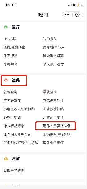 打开“i厦门”小程序,选择“社保”服务模块,进入“退休人员资格认证”。