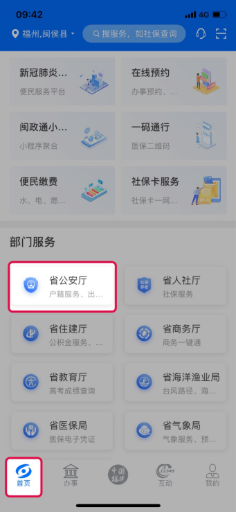 用户实名登录“闽政通App”,首页选择“部门服务”模块打开“省公安厅”服务页面。