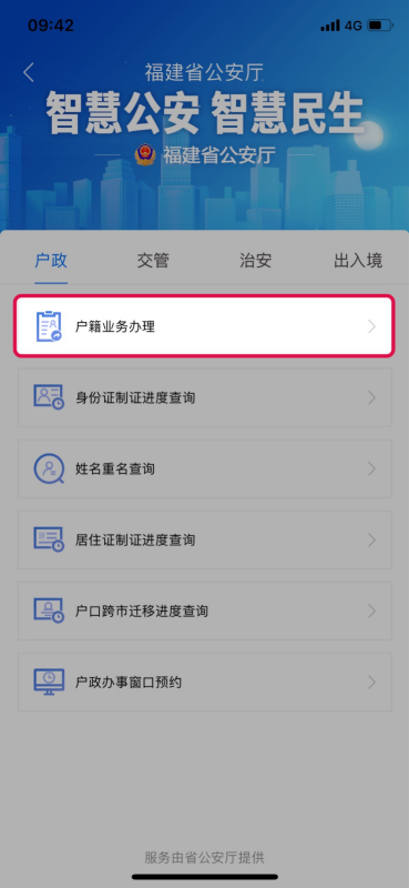 进入“省公安厅”页面,打开“户籍业务办理”服务。