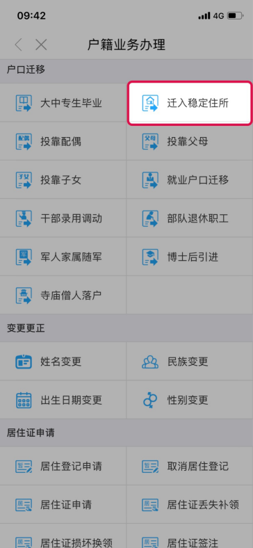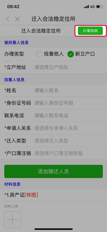 以“迁入稳定住所”落户为例,用户进入申请页面后,可在右上角点击“办事指南”查看申请条件及所需材料等相关信息。