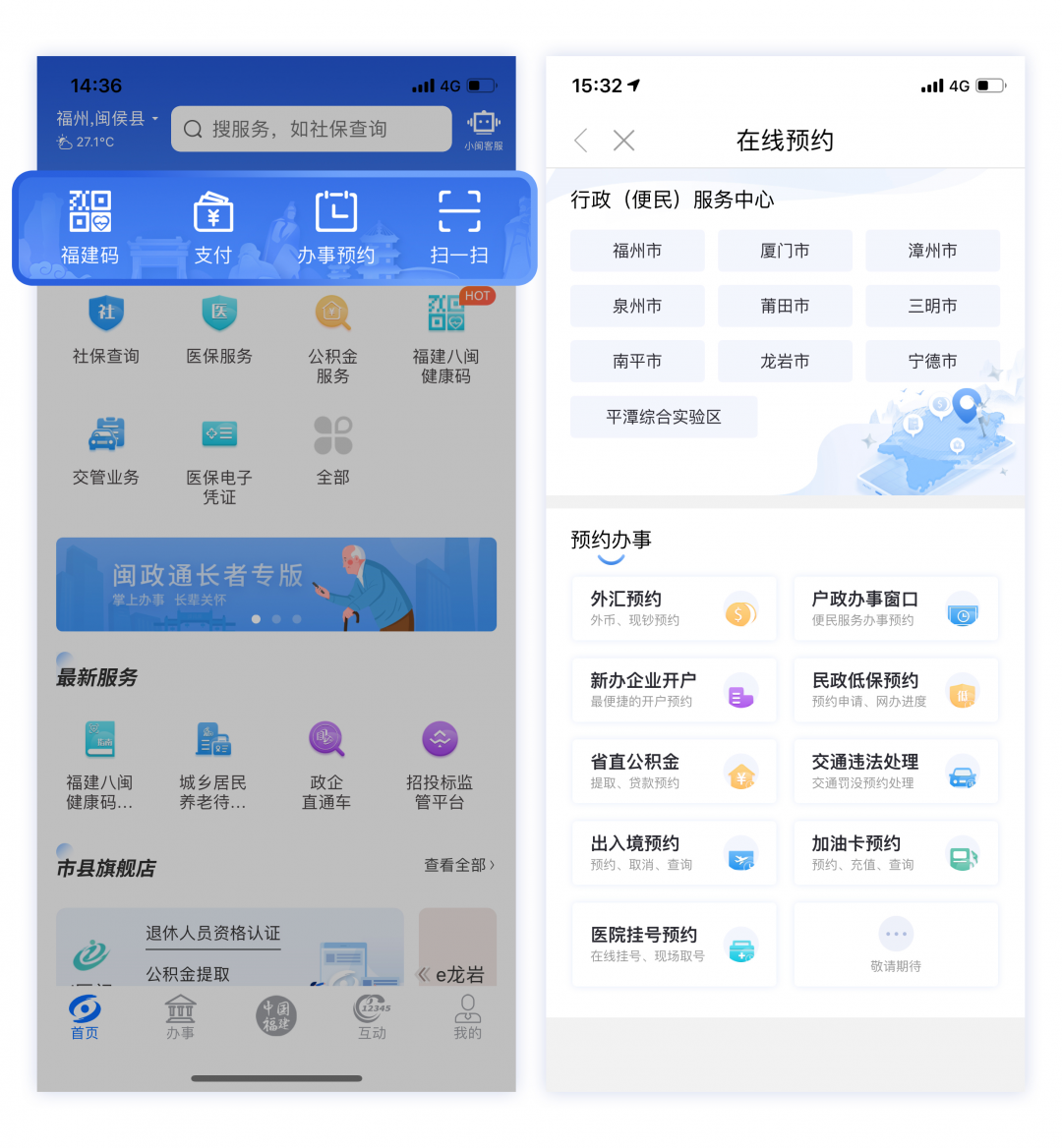 “支付“、“办事预约”将闽政通支付类与办事预约类服务分别整合归纳聚合,在扩充服务的同时,也方便用户在第一时间找到服务并使用。