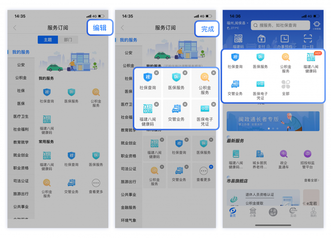 用户点击首页“全部”进入服务订阅页面,点击右上角“编辑”可将常用服务添加至“我的服务”(或对服务内容自由排序),点击“完成”即可在首页服务模块中显示,首页服务由你做主。