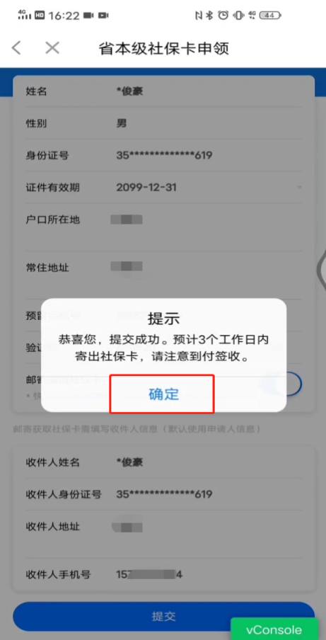 若需邮寄到家,可选择“邮寄获取社保卡”并填写收件地址、手机号等相关信息,然后点击“提交”。