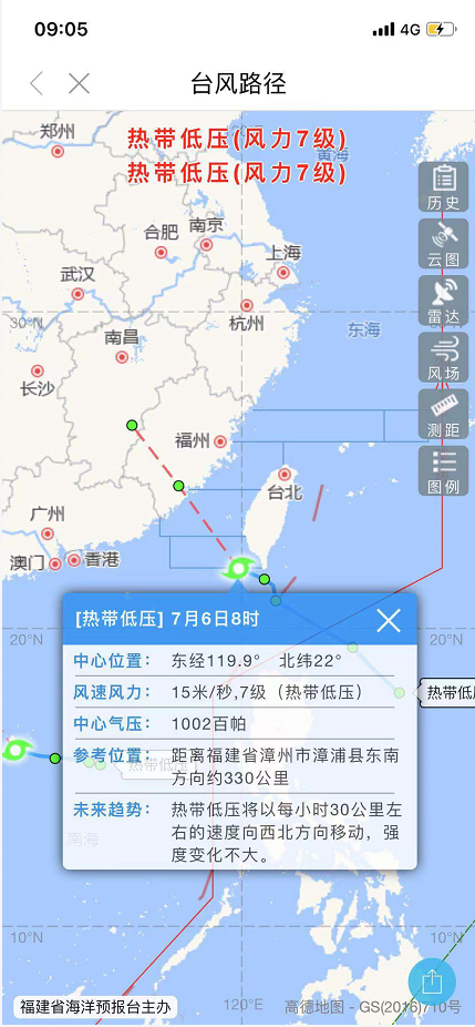 注意啦!今早福建省气象台发布台风蓝色预警信号,7月5日08时菲律宾吕宋岛东部洋面有热带低压生成,今天(6日)05时其距离漳州东山东南方向约390公里(北纬21.7度,东经120.6度),中心附近最大风力7级(15米/秒)。低压中心将以每小时25公里左右的速度向西北方向移动,强度将略有增强,并将于今天晚上在福建漳浦到广东汕头之间沿海登陆(登陆时强度7~8级)。