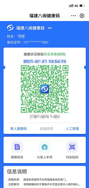 “福建八闽健康码”是以福建省统一身份认证平台的实名身份数据为基础,经福建省卫健委和国家政务服务平台数据核验后生成的个人专属二维码。