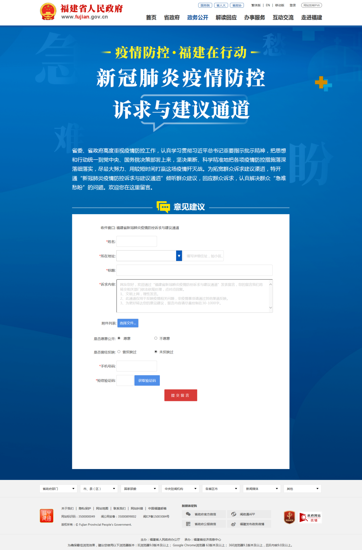 方式二:登陆福建省人民政府网站首页→点击“疫情防控福建在行动”按钮→点击“新冠肺炎疫情防控诉求与建议通道”进入