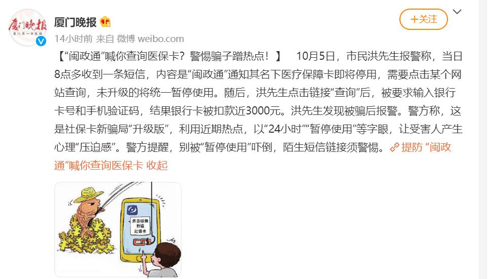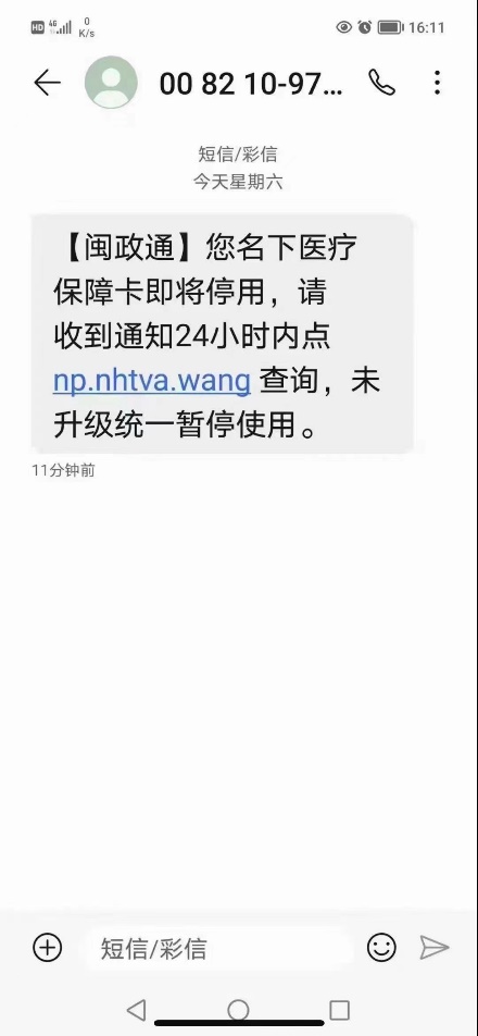 10月5日,市民洪先生报警称:当日8点多收到一条短信,内容是“闽政通”通知其名下医疗保障卡即将停用,需要点击某个网站查询,未升级的将统一暂停使用。