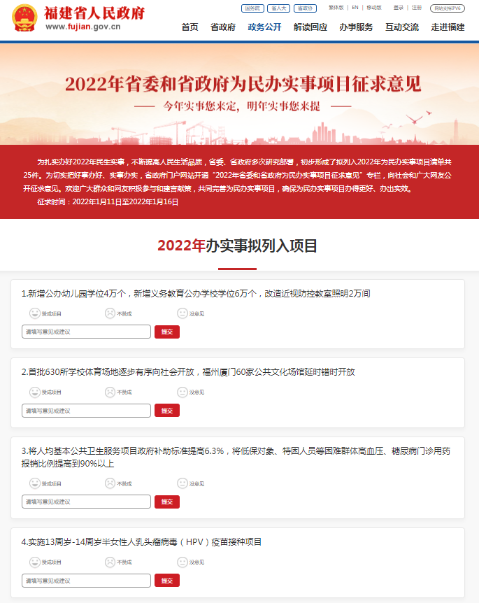 为切实把好事办好、实事办实,日前,省政府门户网站开通“2022年省委和省政府为民办实事项目征求意见”专栏(http://www.fujian.gov.cn/zwgk/ztzl/2022wmbss/),对经过多轮筛选形成的25件2022年省委和省政府为民办实事拟办项目,向社会和广大网友公开征求意见,征集时间为1月11日至1月16日。
